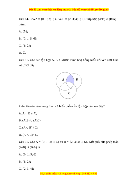 Câu 14. Cho A = {0; 1; 2; 3; 4} và B = {2; 3; 4; 5; 6}. T p h p (A\B) ∩ (B\A) ậ ợ