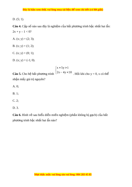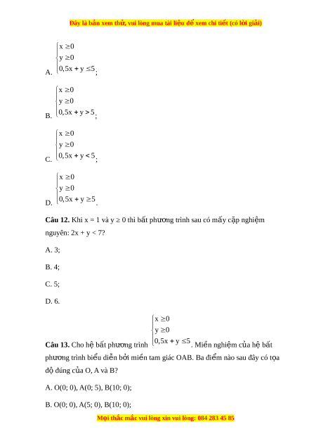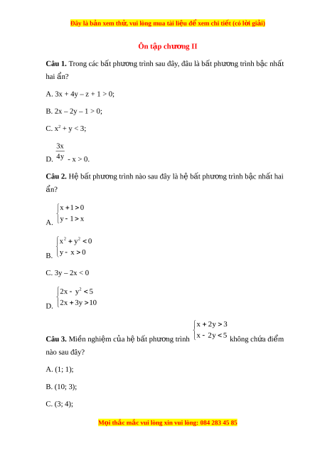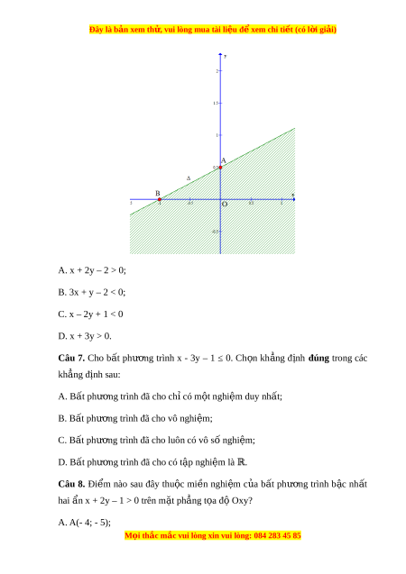 Đây là bản xem th , vu ử i lòng mua tài li u ệ đ xe ể m chi ti t ế (có l i ờ gi i ả ) A. x + 2y – 2 > 0; B. 3x + y – 2 < 0; C. x – 2y + 1 < 0 D. x + 3y > 0. Câu 7. Cho b t ấ phư ng