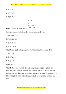 Đây là bản xem th , vu ử i lòng mua tài li u ệ đ xe ể m chi ti t (c ế ó l i ờ gi i ả ) B. B(2; 3); C. C(- 2; -1); D. D(0; -2). x 0 y 0 x y 40 Câu 9. Cho h b ệ t ấ phư ng ơ trình 2x y 5 0 Hai nghi m ệ c a ủ h t ệ rên là nghi m ệ nào trong các nghi m ệ sau? A. (-1; -1), (-1; 0); B. (1; 1), (-1; 0); C. (1; 1), (2; 2); D. (0; -1), (0; 0). Câu 10. C p ( ặ 2; 1) không là nghi m ệ c a ủ b t ấ phư ng ơ trình nào sau đây? A. x + y < 0; B. 2x + 3y > 0; C. x – y > 0; D. 2x – y > 0 Câu 11. B n M ạ inh c n ph ầ i ả làm qu t