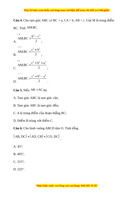 Câu 4. Cho tam giác ABC có BC = a, CA = b, AB = c. G i ọ M là trung đi m ể BC. Tính AM.BC . 2 2 b c AM.BC A. 2 ; 2 2 c b AM.BC B. 2 ; 2 2 2 c b a AM.BC C. 2 ; 2 2 2 c b a AM.BC D. 2 . Câu 5. N u ế AB A C thì