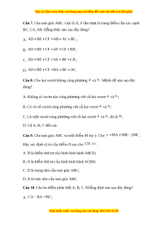 Hãy xác định vị trí c a ủ đi m ể D sao cho CD v . A. D là đi m ể th t ứ c ư a ủ hình bình hành ABCD; B. D là đi m ể th t ứ ư c a hì ủ nh bình hành ACBD; C. D là tr ng t ọ âm c a ủ tam giác ABC; D. D là tr c t ự âm c a t ủ am giác ABC. Câu 10. Cho ba đi m ể phân bi t ệ A, B, C. Kh ng ẳ đ nh nào s ị au đây đúng? A. CA BA B C ; M i