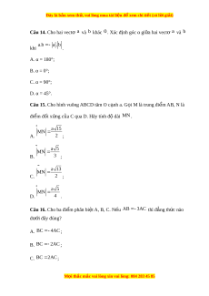 Câu 11. Cho tam giác ABC. T p h ậ p các đi ợ m ể M th a m ỏ ãn MA.BC 0 là: A. m t ộ đi m ể ; B. đư ng t ờ h ng; ẳ C. đo n t ạ h ng; ẳ D. đư ng ờ tròn.