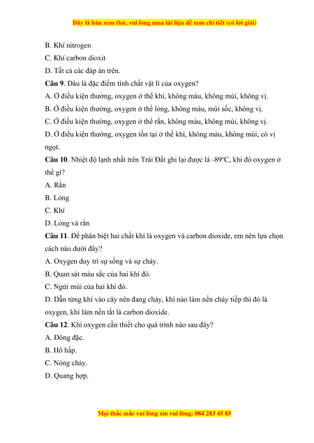 Câu 6. Ở điều kiện thường, khí oxygen có màu gì? A. xanh nhạt B. không màu C. vàng nhạt D. màu hồng
