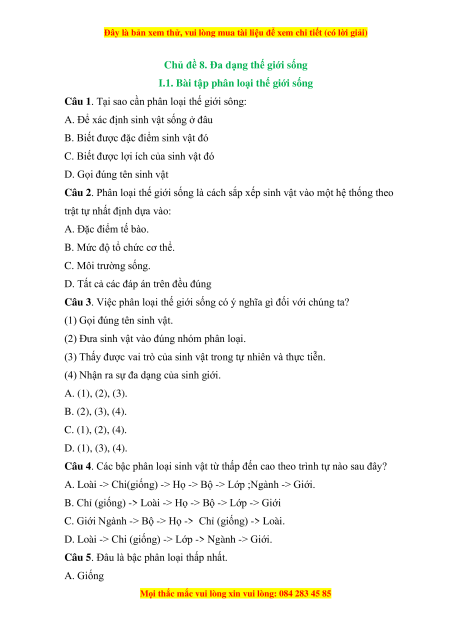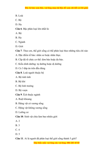 Câu 6. Bậc phân loại lớn nhất là: A. Bộ B. Họ C. Ngành D. Giới