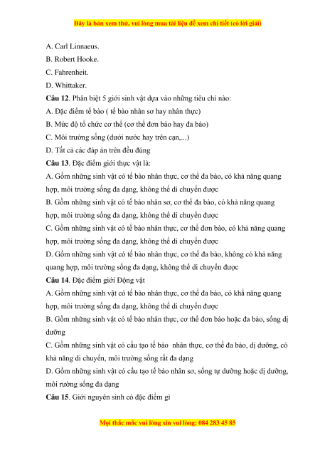 Câu 11. Ai là người đã phân loại thế giới sống thành 5 giới?