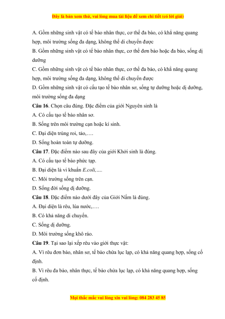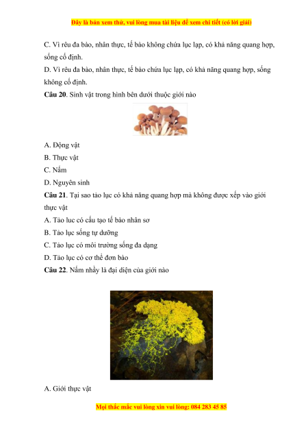 Câu 18. Đặc điểm nào dưới đây của Giới Nấm là đúng.