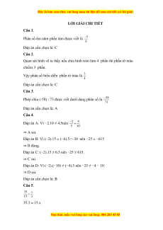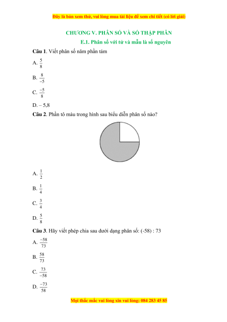 Câu 3. Hãy viết phép chia sau dưới dạng phân số: (-58) : 73 −58 A. 73 58 B. 73 73 C. −58 −73 D. 58