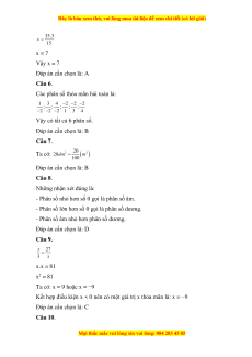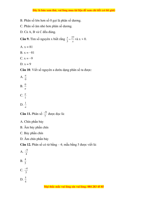 Câu 10. Viết số nguyên a dướu dạng phân số ta được: a A. 0 0 B. a a C. 1 1 D. a −9 Câu 11. Phân số được đọc là: 7 A. Chín phần bảy B. Âm bảy phần chín C. Bảy phần chín D. Âm chín phần bảy