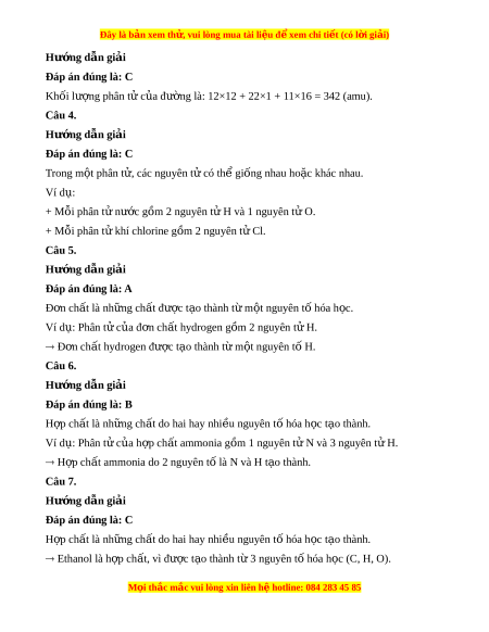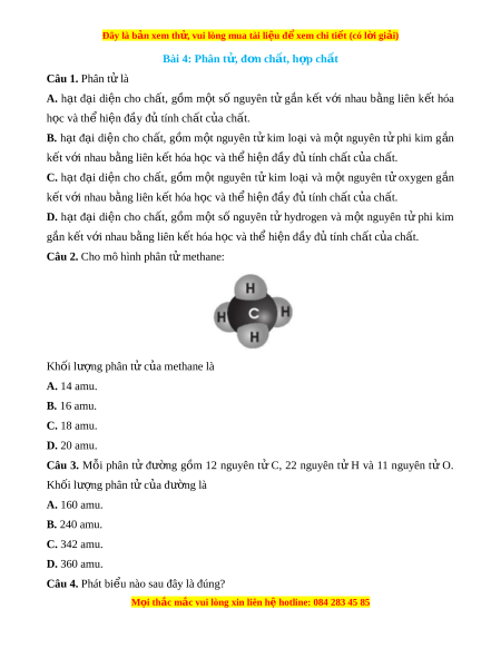 Đây là bản xem th , vu ử i lòng mua tài li u ệ đ xe ể m chi ti t (c ế ó l i ờ gi i ả ) Bài 4: Phân t , đ ử n ch ơ t ấ , h p ch ợ t ấ Câu 1. Phân t l ử à A. h t ạ đ i ạ di n ệ cho ch t ấ , g m ồ m t ộ số nguyên tử g n ắ k t ế v i ớ nhau b ng ằ liên k t ế hóa h c ọ và th hi ể n đ ệ y đ ầ ủ tính ch t ấ c a ủ ch t ấ . B. h t ạ đ i ạ di n ệ cho ch t ấ , g m ồ m t ộ nguyên t ử kim lo i ạ và m t ộ nguyên t ử phi kim g n ắ k t ế v i ớ nhau b ng l ằ iên k t ế hóa h c ọ và th hi ể n đ ệ y đ ầ t ủ ính ch t ấ c a ủ ch t ấ . C. h t ạ đ i ạ di n ệ cho ch t ấ , g m ồ m t ộ nguyên t ử kim lo i ạ và m t ộ nguyên t ử oxygen g n ắ k t ế v i ớ nhau b ng l ằ iên k t ế hóa h c ọ và th hi ể n đ ệ y đ ầ t ủ ính ch t ấ c a ủ ch t ấ . D. h t ạ đ i ạ di n ệ cho ch t ấ , g m ồ m t ộ số nguyên t ử hydrogen và m t ộ nguyên t ử phi kim g n ắ k t ế v i ớ nhau b ng ằ liên k t ế hóa h c và ọ th hi ể n đ ệ y đ ầ t ủ ính ch t ấ c a ch ủ t ấ .