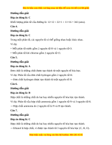 + Mỗi phân tử khí chlorine g m ồ 2 nguyên t C ử l. Câu 5. Hư ng d ớ ẫn gi i ả Đáp án đúng là: A Đ n ơ ch t ấ là nh ng ch ữ t ấ đư c t ợ o ạ thành t m ừ t ộ nguyên t hóa h ố c. ọ Ví d : ụ Phân t c ử a ủ đ n ch ơ t ấ hydrogen g m ồ 2 nguyên t H ử . Đ n ch ơ ất hydrogen đư c t ợ o ạ thành t m ừ t ộ nguyên t H ố . Câu 6. Hư ng d ớ ẫn gi i ả Đáp án đúng là: B H p ợ ch t ấ là nh ng ch ữ t ấ do hai hay nhi u nguyên t ề hóa h ố c t ọ o ạ thành. Ví d : ụ Phân t c ử a ủ h p ch ợ t ấ ammonia g m ồ 1 nguyên t N ử và 3 nguyên t H ử . H p ch ợ ất ammonia do 2 nguyên t l ố à N và H t o ạ thành. Câu 7. Hư ng d ớ ẫn gi i ả Đáp án đúng là: C H p ợ ch t ấ là nh ng ch ữ t ấ do hai hay nhi u nguyên t ề hóa h ố c t ọ o ạ thành. Ethanol là h p ợ ch t ấ , vì đư c ợ t o t ạ hành t 3 nguyên t ừ hóa h ố c ọ (C, H, O). M i