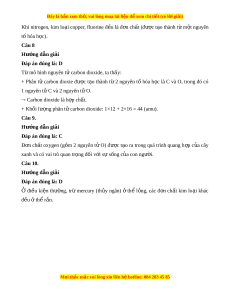 ạ ra trong quá trình quang h p ợ c a ủ cây xanh và có vai trò quan tr ng đ ọ ối v i ớ s s ự ng ố c a con ng ủ ư i ờ ? A. Chlorine. B. Carbon dioxide. C. Oxygen. D. Nitrogen. Câu 10. Ở đi u ki ề ện thư ng, đ ờ n ch ơ ất kim lo i ạ nào t ở h l ể ng? ỏ A. Sodium. B. Calcium. C. Magnesium. D. Mercury. L I Ờ GIẢI CHI TI T Ế Câu 1. Hư ng d ớ ẫn gi i ả Đáp án đúng là: A Phân tử là h t ạ đ i ạ di n ệ cho ch t ấ , g m ồ m t ộ số nguyên tử g n ắ k t ế v i ớ nhau b ng ằ liên k t ế hóa h c và t ọ h hi ể n đ ệ y đ ầ t ủ ính ch t ấ c a ch ủ t ấ . Ví d : ụ Mỗi phân t n ử ư c g ớ m ồ hai nguyên t H ử và m t ộ nguyên t O ử . Câu 2. Hư ng d ớ ẫn gi i ả Đáp án đúng là: B Phân t m ử ethane g m