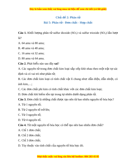 Đây là bản xem th , vu ử i lòng mua tài li u ệ đ xe ể m chi ti t (c ế ó l i ờ gi i ả ) Chủ đ 2 ề : Phân tử Bài 5: Phân t - ử Đ n ơ ch t ấ - H p ch ợ t ấ Câu 1. Kh i ố lư ng