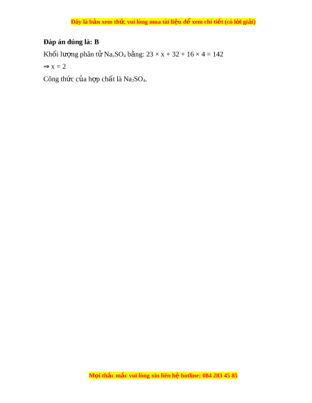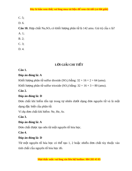 ất NaxSO4 có khối lư ng phân ợ t l ử à 142 amu. Giá tr c ị a ủ x là? A. 1; B. 2; C. 3; D. 4. LỜI GIẢI CHI TI T Ế Câu 1. Đáp án đúng là: A Kh i ố lư ng ợ phân t s ử ulfur dioxide (SO2) b ng: ằ 32 + 16 × 2 = 64 (amu). Kh i ố lư ng ợ phân t s ử ulfur trioxide (SO3) b ng: ằ 32 + 16 × 3 = 80 (amu). Câu 2. Đáp án đúng là: D Đ n ơ ch t ấ khí hi m ế t n ồ t i ạ trong tự nhiên dư i ớ d ng ạ đ n ơ nguyên tử và là m t ộ d ng đ ạ c ặ bi t ệ c a phân t ủ . ử Ví d đ ụ n ch ơ t ấ khí hi m ế : Ne, He, Ar. Câu 3. Đáp án đúng là: A Đ n ch ơ ất đư c ợ t o nên t ạ m ừ t ộ nguyên t hóa h ố c. ọ Câu 4. Đáp án đúng là: D Từ m t ộ nguyên tố hóa h c ọ có thể t o ạ 1, 2 ho c ặ nhi u ề đ n ơ ch t ấ tùy thu c ộ vào tính ch t ấ c a ủ nguyên t hóa h ố c đó. ọ M i