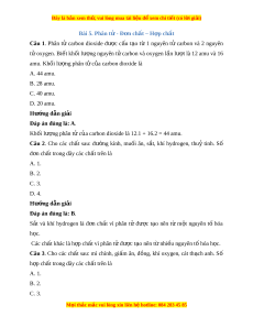 Câu 1. Phân tử carbon dioxide đư c ợ c u ấ t o ạ t ừ 1 nguyên t ử carbon và 2 nguyên t oxygen. ử Bi t ế kh i ố lư ng nguyên t ợ car ử bon và oxygen l n l ầ ư t ợ là 12 amu và 16 amu. Khối lư ng phân ợ t c ử a car ủ bon dioxide là A. 44 amu. B. 28 amu. C. 40 amu. D. 20 amu. Hư ng d ớ ẫn gi i ả