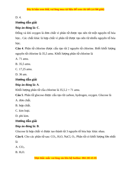 Đáp án đúng là: A. Khối lư ng phân t ợ ử c a chl ủ orine là 35,5.2 = 71 amu. Câu 5. Phân t gl ử ucose đư c ợ c u t ấ o t ạ car ừ