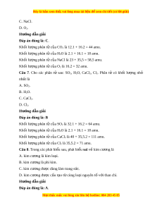 Câu 7. Cho các phân tử sau: SO2, H2O, CaCl2, Cl2. Phân tử có kh i ố lư ng ợ nhỏ nhất là A. SO2. B. H2O. C. CaCl2. D. Cl2. Hư ng d ớ ẫn gi i ả