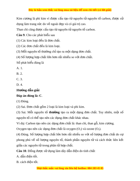 ắ , khí hydrogen, thuỷ tinh. Số đ n ơ ch t ấ trong dãy các ch t ấ trên là A. 1. B. 2. C. 3. D. 4. Hư ng d ớ ẫn gi i ả