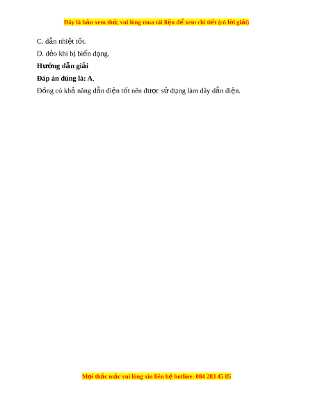 Câu 10. Đ ng đ c s d ng làm dây d n đi n do tính ch tồ ượ ử ụ ẫ ệ ấ