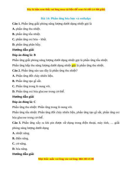 Đây là bản xem th , vu ử i lòng mua tài li u ệ đ xe ể m chi ti t (c ế ó l i ờ gi i ả ) Bài 14: Ph n ả ng hóa h ứ c và ent ọ halpy Câu 1. Ph n ả ng gi ứ i ả phóng năng lư ng ợ dư i ớ d ng nhi ạ t ệ g i ọ là A. ph n ả ng t ứ hu nhi t ệ . B. ph n ả ng t ứ a ỏ nhi t ệ . C. ph n ả ng oxi ứ hóa – kh . ử D. ph n ả ng phân h ứ y ủ . Hư ng d ớ ẫn gi i ả Đáp án đúng là: B Ph n ả ng gi ứ i ả phóng năng lư ng ợ dư i ớ d ng nhi ạ t ệ g i ọ là ph n ả ng t ứ a nhi ỏ t ệ . Ph n ả ng h ứ p t ấ hu năng lư ng d ợ ư i ớ d ng ạ nhi t ệ g i ọ là ph n ả ng t ứ hu nhi t ệ . Câu 2. Ph n ả ng nào s ứ au đây là ph n ả ng ứ thu nhi t ệ ? A. Ph n ả ng đ ứ t ố cháy nhiên li u. ệ B. Ph n ả ng t ứ o ạ g s ỉ t ắ . C. Ph n ả ng t ứ rong lò nung vôi. D. Ph n ả ng oxi ứ hóa glucose trong c t ơ h . ể Hư ng d ớ ẫn gi i ả Đáp án đúng là: C Ph n ả ng t ứ hu nhi t ệ : Ph n ả ng t ứ rong lò nung vôi. Ph n ả ng ứ t a ỏ nhi t ệ : Ph n ả ng ứ đ t ố cháy nhiên li u, ệ ph n ả ng ứ t o ạ g ỉs t ắ , ph n ả ng ứ oxi hóa glucose trong c t ơ h . ể Câu 3. Ph n ả ng ứ x y ả ra khi pin đư c ợ sử d ng ụ trong đi n ệ tho i ạ , máy tính, … gi i ả phóng năng lư ng ợ dư i ớ d ng ạ A. nhiệt năng. B. điện năng. C. cơ năng. D. hóa năng. Hư ng d ớ ẫn gi i ả M i ọ thắc m c