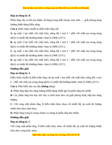 Đây là bản xem th , vu ử i lòng mua tài li u ệ đ xe ể m chi ti t (c ế ó l i ờ gi i ả ) Đáp án đúng là: B Ph n ả ng ứ x y ả ra khi pin đư c ợ s ử d ng ụ trong đi n ệ tho i ạ , máy tính, … gi i ả phóng năng lư ng ợ dư i ớ d ng đi ạ n năng. ệ Câu 4. Đi u ki ề ện chuẩn là đi u ki ề n ệ ng v ứ i ớ A. áp su t ấ 1 bar (đ i ố v i ớ ch t ấ khí), n ng ồ độ 1 mol L-1 (đ i ố v i ớ ch t ấ tan trong dung dịch) và nhi t ệ đ t ộ hư ng đ ờ ư c ợ ch n l ọ à 298K (25oC). B. áp su t ấ 2 bar (đ i ố v i ớ ch t ấ khí), n ng ồ độ 1 mol L-1 (đ i ố v i ớ ch t ấ tan trong dung dịch) và nhi t ệ đ t ộ hư ng đ ờ ư c ợ ch n l ọ à 298K (25oC). C. áp su t ấ 1 bar (đ i ố v i ớ ch t ấ khí), n ng ồ độ 2 mol L-1 (đ i ố v i ớ ch t ấ tan trong dung dịch) và nhi t ệ đ t ộ hư ng đ ờ ư c ợ ch n l ọ à 298K (25oC). D. áp su t ấ 2 bar (đ i ố v i ớ ch t ấ khí), n ng ồ độ 2 mol L-1 (đ i ố v i ớ ch t ấ tan trong dung dịch) và nhi t ệ đ t ộ hư ng đ ờ ư c ợ ch n l ọ à 298K (25oC). Hư ng d ớ ẫn gi i ả Đáp án đúng là: A Đi u ề ki n ệ chu n ẩ là đi u ề ki n ệ ng ứ v i ớ áp su t ấ 1 bar (đ i ố v i ớ ch t ấ khí), n ng ồ đ ộ 1 mol L-1 (đ i ố v i ớ ch t ấ tan trong dung d ch) ị và nhi t ệ đ t ộ hư ng đ ờ ư c ợ ch n l ọ à 298K (25oC).