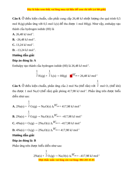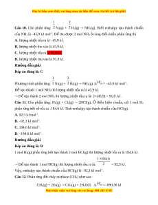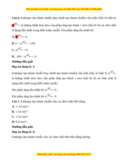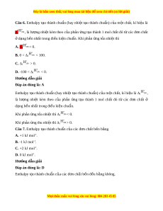 Đây là bản xem th , vu ử i lòng mua tài li u ệ đ xe ể m chi ti t (c ế ó l i ờ gi i ả ) Câu 6. Enthalpy t o ạ thành chu n ẩ (hay nhi t ệ t o ạ thành chu n ẩ ) c a ủ m t ộ ch t ấ , kí hi u ệ là o H f 298 , là lư ng ợ nhi t ệ kèm theo c a ph ủ n ả ng t ứ o t ạ hành 1 mol ch t ấ đó t các đ ừ n ơ ch t ấ ở d ng b ạ n nh ề ất trong đi u ki ề n chu ệ n. K ẩ hi ph n ả ng t ứ a nhi ỏ t ệ thì o A. H f 298 < 0. o B. 0 < H f 298 < 100. o C. H f 298 > 0. o D. -100 < H f 298 < 0. Hư ng d ớ ẫn gi i ả Đáp án đúng là: A o Enthalpy t o ạ thành chu n ẩ (hay nhi t ệ t o ạ thành chu n) ẩ c a ủ m t ộ ch t ấ , kí hi u ệ là H f 298 , là lư ng ợ nhi t ệ kèm theo c a ủ ph n ả ng ứ t o ạ thành 1 mol ch t ấ đó từ các đ n ơ ch t ấ ở d ng ạ b n nh ề t ấ trong đi u ki ề n chu ệ n. ẩ o Khi ph n ả ng t ứ a nhi ỏ t ệ thì H f 298 < 0. o Khi ph n ả ng t ứ hu nhi t ệ thì H f 298 > 0. Câu 7. Enthalpy t o t ạ hành chu n c ẩ a ủ các đ n ch ơ t ấ b n b ề ng ằ A. +1 kJ mol-1. B. -1 kJ mol-1. C. +2 kJ mol-1. D. 0 kJ mol-1. Hư ng d ớ ẫn gi i ả Đáp án đúng là: D Enthalpy t o t ạ hành chu n c ẩ a ủ các đ n ch ơ t ấ b n đ ề u ề b ng không. ằ M i ọ thắc m c