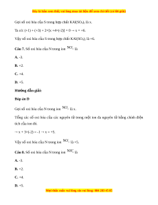 Câu 7. Số oxi hóa c a N ủ trong ion NO3 là A. -3. B. +2. C. +4. D. +5. Hư ng d ớ ẫn gi i ả : Đáp án D G i ọ số oxi hóa c a N ủ trong ion NO3 là x. T ng ổ các số oxi hóa c a