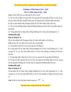 Câu 1. Phát bi u nào s ể au đây sai v s ề ố oxi hóa? A. Số oxi hóa là đi n ệ tích quy ư c ớ c a ủ nguyên t t ử rong phân t khi ử coi t t ấ c ả các electron liên k t ế đ u chuy ề n ể hoàn toàn v nguyên t ề có ử đ âm ộ đi n l ệ n h ớ n; ơ B. Số oxi hóa đư c ợ bi t ế d ở ng ạ s đ ố i ạ s , s ố ố vi t ế trư c, ớ d u vi ấ t ế sau; C. Số oxi hóa thư ng ờ đư c ợ dùng đ ể l p ậ phư ng ơ trình hóa h c ọ c a ủ ph n ả ng ứ oxi hóa kh ; ử D. Trong phân t các ử h p ch ợ t ấ , thông thư ng s ờ oxi ố hóa c a ủ hydrogen là +1. Hư ng d ớ ẫn gi i ả Đáp án đúng là: B Số oxi hóa đư c bi ợ t ế ở d ng s ạ ố đ i ạ số, d u vi ấ t ế trư c, ớ s vi ố t ế sau. Câu 2. Quy t c ắ xác đ nh s ị oxi ố