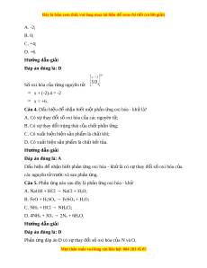 Câu 4. Dấu hiệu đ nh ể n ậ bi t ế m t ộ ph n ả ng oxi ứ hóa - kh l ử à? A. Có s t ự hay đ i ổ s oxi ố hóa c a ủ các nguyên t ; ử B. Có sự thay đ i ổ tr ng t ạ hái c a ủ ch t ấ ph n ả ng; ứ C. Có xu t ấ hi n h ệ i n s ệ n ph ả m ẩ là ch t ấ khí; D. Có xu t ấ hi n s ệ n ph ả m ẩ là ch t ấ k t ế t a. ủ Hư ng d ớ ẫn gi i ả Đáp án đúng là: A Dấu hi u ệ để nh n ậ bi t ế ph n ả ng ứ oxi hóa - kh ử là có s ự thay đ i ổ s ố oxi hóa c a ủ các nguyên t t ử rư c và s ớ au ph n ả ng. ứ Câu 5. Ph n ả ng nào s ứ au đây là ph n ả ng ứ oxi hóa - khử A. NaOH + HCl → NaCl + H2O;