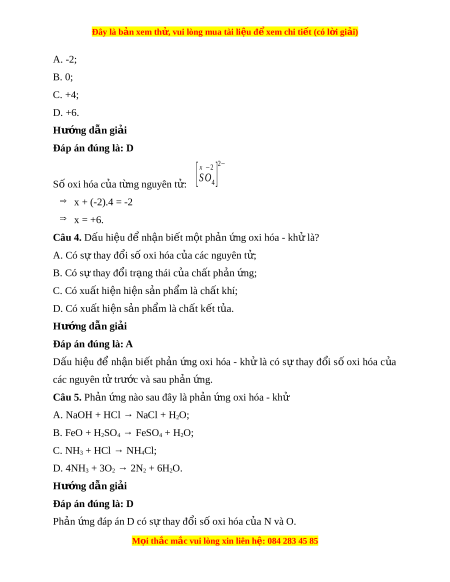 Đây là bản xem th , vu ử i lòng mua tài li u ệ đ xe ể m chi ti t (c ế ó l i ờ gi i ả ) A. -2; B. 0; C. +4; D. +6. Hư ng d ớ ẫn gi i ả Đáp án đúng là: D 2− [x −2 SO ] Số oxi hóa c a t ủ ng nguyên ừ t : ử 4 ⇒ x + (-2).4 = -2 ⇒ x = +6.