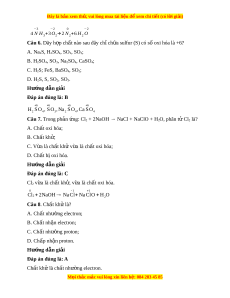 3+3 O2→ 2 N 2+6 H 2 Câu 6. Dãy h p ch ợ t ấ nào sau đây ch ch ỉ a s ứ ulfur (S) có s oxi ố hóa là +6? A. Na2S, H2SO4, SO2, SO3; B. H2SO4, SO3, Na2SO4, CaSO4; C. H2S; FeS, BaSO4, SO2; D. H2S, S, SO2, SO3. Hư ng d ớ ẫn gi i ả Đáp án đúng là: B 6 6 6 6 H S O , S O , Na S O ,Ca S O 2 4 3 2 4 4 Câu 7. Trong ph n ả ng: ứ