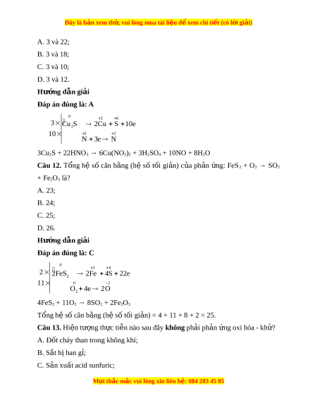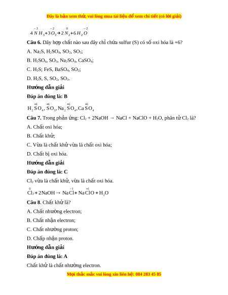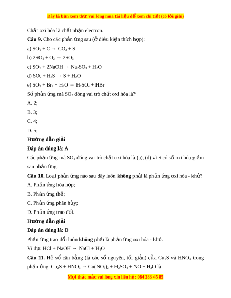 Đây là bản xem th , vu ử i lòng mua tài li u ệ đ xe ể m chi ti t (c ế ó l i ờ gi i ả ) Chất oxi hóa là ch t ấ nh n ậ electron. Câu 9. Cho các ph n ả ng s ứ au ( đi ở u ki ề n t ệ hích h p) ợ : a) SO2 + C → CO2 + S b) 2SO2 + O2 → 2SO3