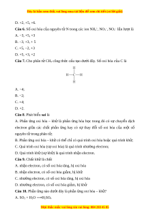 Câu 6. Số oxi hóa c a nguyên ủ t N ử trong các ion NH + − − 4 , NO3 , NO2 lần lư t ợ là A. −3, +5, +3 B. −3, +3, + 5 C. +5, −2, +3 D. +5, +3, +2 Câu 7. Cho phân t C ử H4 công th c c ứ ấu t o ạ dư i ớ đây. S oxi ố hóa c a C ủ là A. −4; B. −2; C. +4; D. +2. Câu 8. Phát bi u ể sai là A. Ph n ả ng