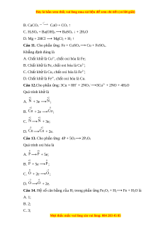C. Quá trình oxi hóa (sự oxi hóa) là quá trình như ng el ờ ectron; D. Quá trình kh ( ử s kh ự ) ử là quá trình nh n el ậ ectron. Câu 9. Ch t ấ khử là chất A. nh n ậ electron, có s oxi ố hóa tăng, b oxi ị hóa B. nh n el ậ ectron, có s oxi ố hóa gi m ả , b kh ị ử C. như ng el ờ ectron, có s oxi ố hóa tăng, b oxi ị hóa D. như ng ờ electron, có s oxi ố hóa gi m ả , b kh ị ử Câu 10. Ph n ả ng nào d ứ ư i ớ đây là ph n ả ng oxi ứ hóa – kh ? ử A. SO3 + H2O ⟶H2SO4 M i ọ thắc m c