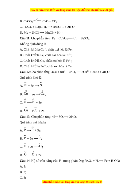 ử à Fe2+, chất oxi hóa là Cu. Câu 12.Cho ph n ả ng: ứ 3Cu + 8H+ + 2NO − 3 ⟶3Cu2+ + 2NO + 4H2O Quá trình khử là 5 2 A. N + 3e ⟶ N ; 2 0 B. Cu + 2e ⟶Cu ; 2 5 C. N ⟶ N + 3e; 0 2 D. Cu ⟶Cu + 2e. Câu 13. Cho ph n ả ng: ứ 4P + 5O2⟶ 2P2O5 Quá trình oxi hóa là 0 5 A. P ⟶ P + 5e; 5 0 B. P + 5e ⟶P ; 0 2 C. O + 2e ⟶O ; 2 0 D. O ⟶O + 2e.