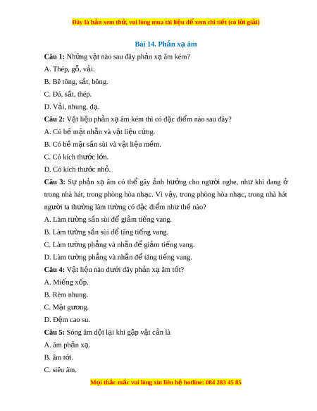 Đây là bản xem th , vu ử i lòng mua tài li u ệ đ xe ể m chi ti t (c ế ó l i ờ gi i ả ) Bài 14. Ph n x ả â ạ m Câu 1: Nh ng ữ v t ậ nào sau đây ph n x ả ạ âm kém? A. Thép, gỗ, v i ả . B. Bê tông, s t ắ , bông. C. Đá, s t ắ , thép. D. V i ả , nhung, d . ạ Câu 2: V t ậ li u ph ệ n ả x âm ạ kém thì có đ c đi ặ m ể nào sau đây? A. Có b m ề t ặ nh n và v ẵ t ậ li u c ệ ng. ứ B. Có b m ề t ặ s n s ầ ùi và v t ậ li u m ệ m ề . C. Có kích thư c l ớ n. ớ D. Có kích thư c ớ nh . ỏ Câu 3: Sự ph n ả xạ âm có thể gây nh ả hư ng ở cho ngư i ờ nghe, như khi đang ở