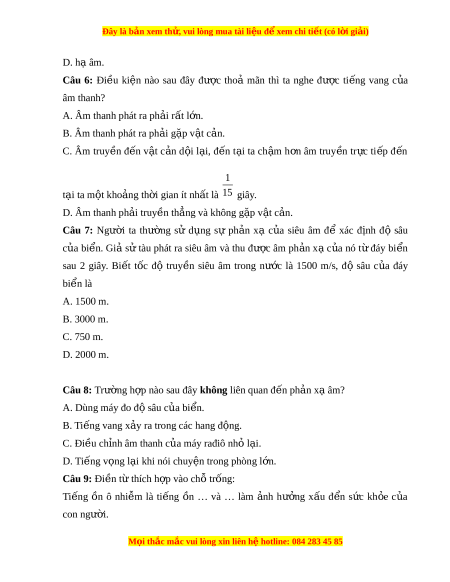 ợ thoả mãn thì ta nghe đư c ợ ti ng ế vang c a ủ âm thanh? A. Âm thanh phát ra ph i ả r t ấ l n. ớ B. Âm thanh phát ra ph i ả g p v ặ t ậ c n. ả C. Âm truy n ề đ n ế v t ậ c n ả d i ộ l i ạ , đ n ế t i ạ ta ch m ậ h n ơ âm truy n ề tr c ự ti p ế đ n ế 1 t i ạ ta m t ộ kho ng ả th i ờ gian ít nh t ấ là 15 giây. D. Âm thanh ph i ả truy n t ề h ng và ẳ không g p v ặ t ậ c n. ả Câu 7: Ngư i ờ ta thư ng ờ sử d ng ụ sự ph n ả xạ c a ủ siêu âm để xác đ nh ị độ sâu c a ủ bi n. ể Giả s