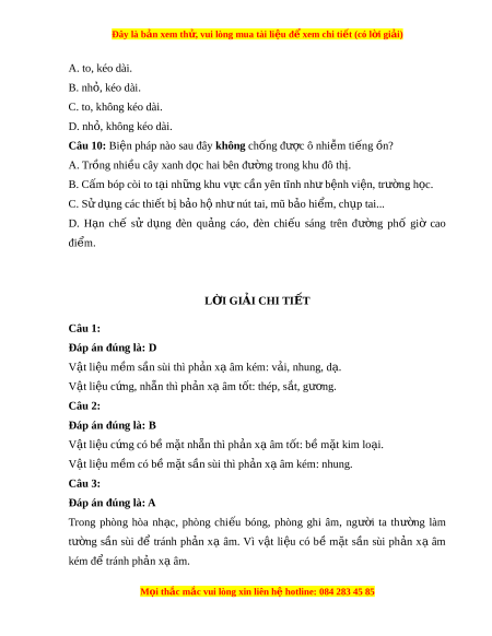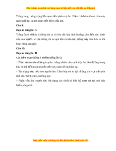 Câu 10: Biện pháp nào sau đây không chống đư c ợ ô nhi m ễ ti ng ế n? ồ A. Trồng nhi u cây ề xanh d c hai ọ bên đư ng ờ trong khu đô th . ị B. Cấm bóp còi to t i ạ nh ng khu v ữ c c ự n yên t ầ ĩnh nh b ư nh vi ệ n, t ệ rư ng ờ h c. ọ C. S d ử ng các ụ thi t ế b b ị o h ả nh ộ nút ư tai, mũ b o ả hi m ể , ch p t ụ ai... D. H n ạ chế sử d ng ụ đèn qu ng ả cáo, đèn chi u ế sáng trên đư ng ờ phố giờ cao đi m ể . LỜI GIẢI CHI TI T Ế Câu 1: Đáp án đúng là: D V t ậ li u m ệ m ề s n s ầ ùi thì ph n ả x âm ạ kém: v i ả , nhung, d . ạ V t ậ li u c ệ ng, nh ứ n ẵ thì ph n x ả âm ạ t t ố : thép, s t ắ , gư ng. ơ Câu 2: Đáp án đúng là: B V t ậ li u c ệ ng có b ứ ề m t ặ nh n t ẵ hì ph n ả x âm ạ t t ố : b m ề t ặ kim lo i ạ . V t ậ li u m ệ m ề có b m ề t ặ s n s ầ ùi thì ph n ả x âm ạ kém: nhung. Câu 3: Đáp án đúng là: A Trong phòng hòa nh c, ạ phòng chi u
