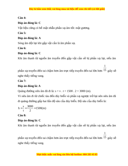 Đây là bản xem th , vu ử i lòng mua tài li u ệ đ xe ể m chi ti t (c ế ó l i ờ gi i ả ) Câu 4: Đáp án đúng là: C V t ậ li u c ệ ng có b ứ ề m t ặ nh n ph ẵ n ả x âm ạ t t ố : m t ặ gư ng. ơ Câu 5: Đáp án đúng là: A Sóng âm d i ộ l i ạ khi g p ặ v t ậ c n ả là âm ph n x ả . ạ Câu 6: Đáp án đúng là: C Khi âm thanh từ ngu n ồ âm truy n ề đ n ế g p ặ v t ậ c n ả sẽ bị ph n ả xạ l i ạ , n u ế âm 1 ph n x ả ạ truy n đ ề n ế tai ch m ậ h n âm ơ tr c t ự i p t ế ruy n đ ề n t ế ai l n h ớ n ơ 15 giây sẽ nghe thấy ti ng ế vang. Câu 7: Đáp án đúng là: A Quãng đư ng s ờ
