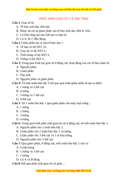 Câu 2: Giảm phân tạo ra loại tế bào nào ? A. Tế bào có bộ NST 2n. B. Giao tử có bộ NST n. C. Tinh trùng có bộ NST n. D. Trứng có bộ NST n.