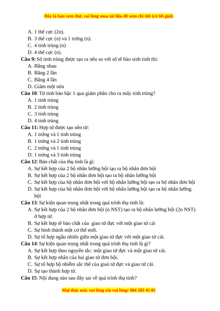 Câu 11: Hợp tử được tạo nên từ: A. 1 trứng và 1 tinh trùng B. 1 trứng và 2 tinh trùng C. 2 trứng và 1 tinh trùng D. 1 trứng và 3 tinh trùng