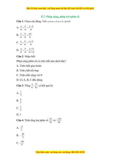 C. Tính chất cộng với 0 D. Cả A, B, C đều đúng 4 27 Câu 3. Tổng + có kết quả là: 6 81 1 A. 3 4 B. 3 3 C. 4 D. 1 35 −125