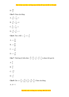 + ta được kết quả là: 7 4 5 7 4 9 A. 5 11 B. 5 −11 C. 5 −1 D. 5 1 5 − 2 8 − 3 Câu 8. Cho A = + + + + . Chọn câu đúng: 4 13 11 13 4 A. A > 1