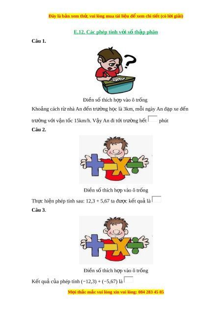 Đây là bản xem th , vu ử i lòng mua tài li u ệ đ xe ể m chi ti t ế (có l i ờ gi i ả ) E .12. C ác phép tính v i ớ s t ố h p p ậ hân Câu 1. Đi n s ề ố thích h p vào ô t ợ r ng ố Kho ng cách ả t nhà ừ An đ n ế trư ng ờ h c l ọ à 3km, m i ỗ ngày An đ p xe ạ đ n ế trư ng ờ v i ớ v n t ậ ốc 15km/h. V y ậ An đi t i ớ trư ng h ờ t ế phút Câu 2. Đi n s ề ố thích h p vào ợ ô trống Th c ự hi n phép ệ