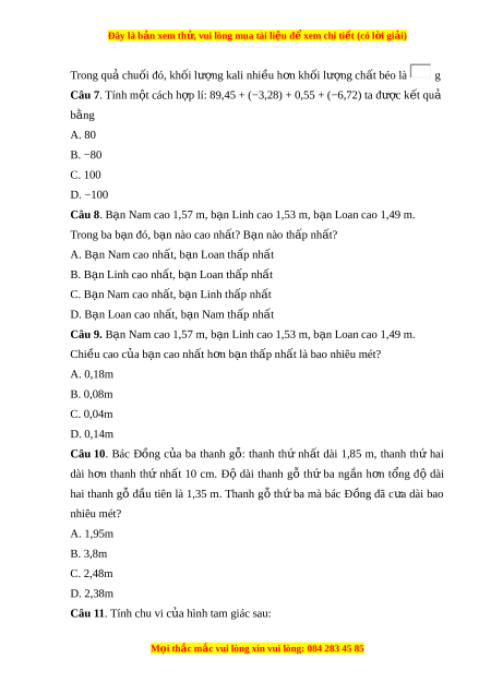 ợ lí: 89,45 + (−3,28) + 0,55 + (−6,72) ta đư c ợ k t ế qu ả b ng ằ A. 80 B. −80 C. 100 D. −100 Câu 8. B n ạ Nam cao 1,57 m, b n ạ Linh cao 1,53 m, b n ạ Loan cao 1,49 m. Trong ba b n ạ đó, b n nào cao ạ nh t ấ ? B n nào ạ th p nh ấ t ấ ? A. B n ạ Nam cao nh t ấ , b n L ạ oan th p nh ấ t ấ B. B n L ạ inh cao nh t ấ , b n L ạ oan th p nh ấ t ấ C. B n N ạ am cao nh t ấ , b n ạ Linh th p nh ấ t ấ D. B n ạ Loan cao nh t ấ , b n ạ Nam th p nh ấ t ấ Câu 9. B n ạ Nam cao 1,57 m, b n ạ Linh cao 1,53 m, b n ạ Loan cao 1,49 m. Chi u cao ề c a b ủ n ạ cao nh t ấ h n b ơ n t ạ h p nh ấ t ấ là bao nhiêu mét? A. 0,18m B. 0,08m C. 0,04m D. 0,14m