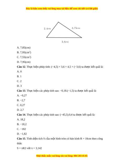 Đây là bản xem th , vu ử i lòng mua tài li u ệ đ xe ể m chi ti t ế (có l i ờ gi i ả ) A. 7,85(cm) B. 7,95(cm2) C. 7,55(cm2) D. 7,95(cm) Câu 12. Th c hi ự