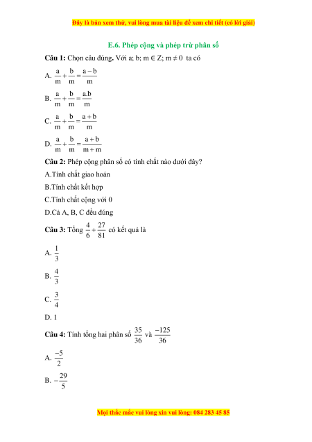 Câu 2: Phép cộng phân số có tính chất nào dưới đây?
