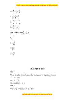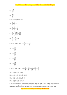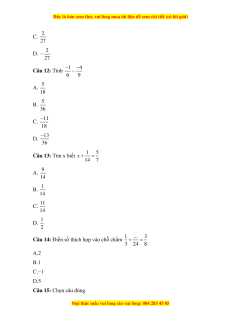 2 C. 27 2 D. − 27 1 − 4 − Câu 12: Tính − 6 9 5 A. 18 5 B. 36 11 − C. 18 −13 D. 36 Câu 13: Tìm x biết 1 5 x + = 14 7 9 A. 14 1 B. 14 11 C. 14 1 D. 2 1 ... 3
