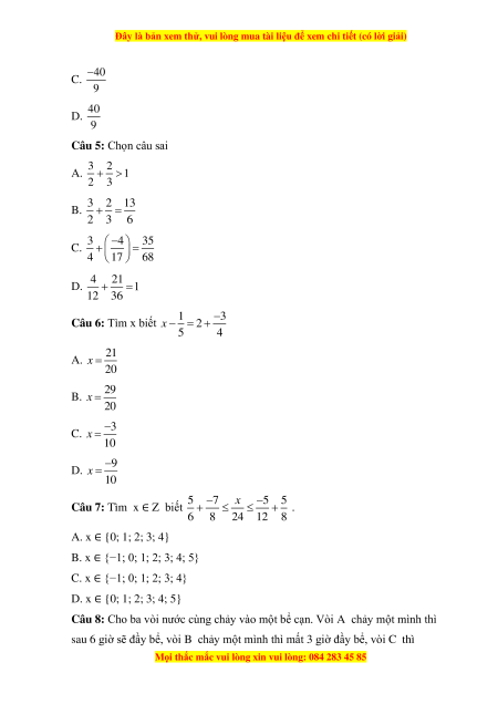 Câu 7: Tìm x ∈ Z biết + + . 6 8 24 12 8 A. x ∈ {0; 1; 2; 3; 4}