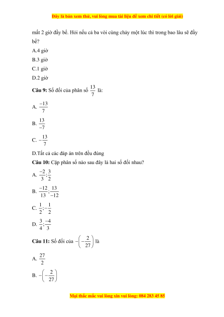 Câu 9: Số đối của phân số 13 là: 7 −13 A. 7 13 B. − 7 13 C. − 7