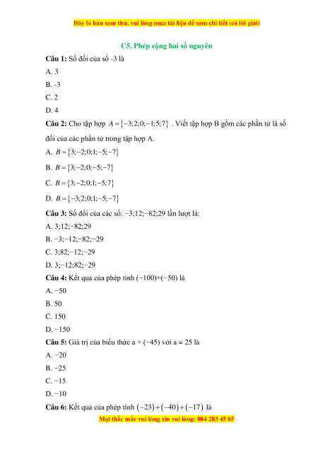 Câu 4: Kết quả của phép tính (−100)+(−50) là A. −50 B. 50 C. 150 D. −150